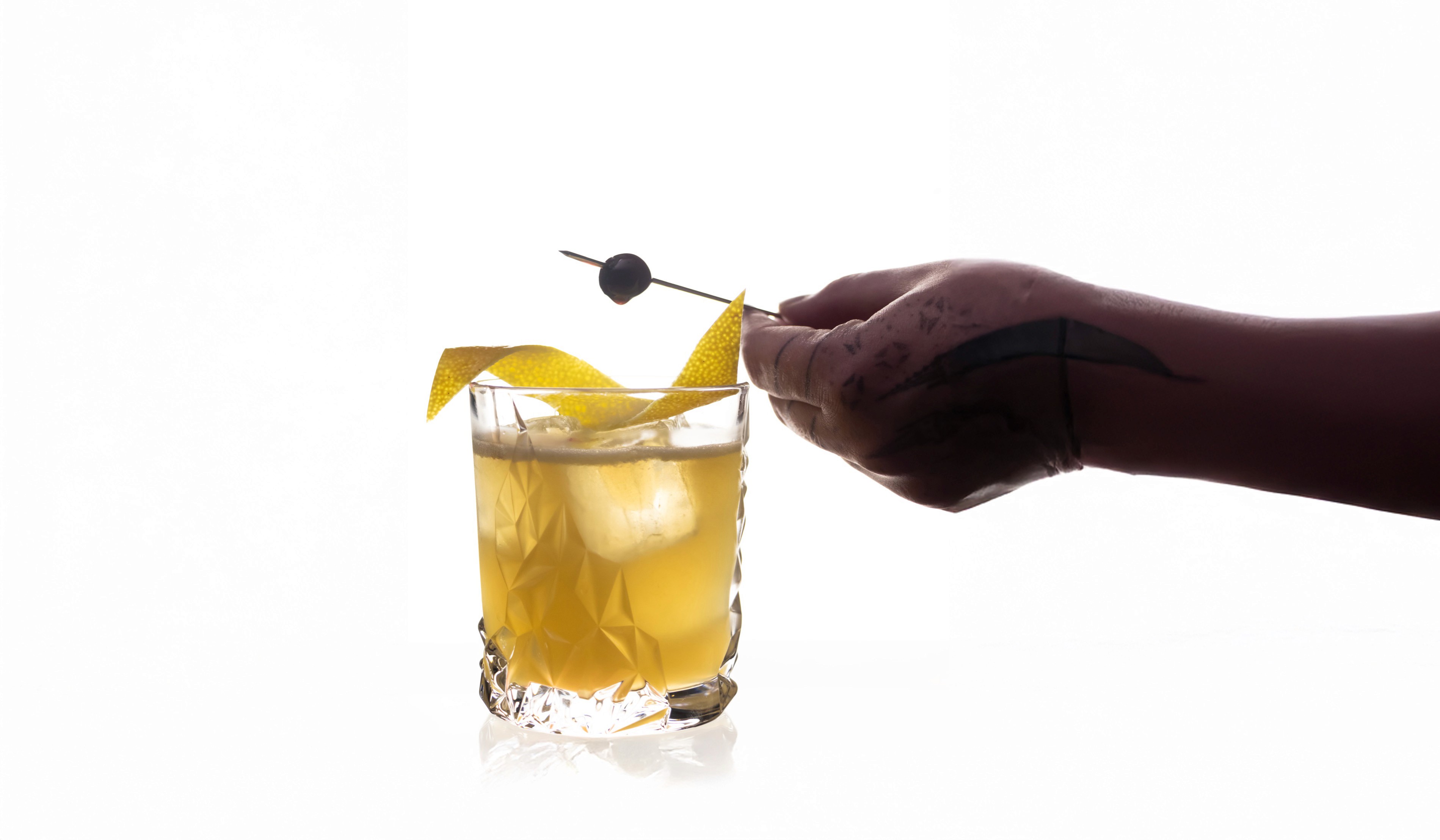 Seedlip Spice 94, selbstgemachter Popcorn Sirup, frischer Zitronensaft, Eis & Popcorn